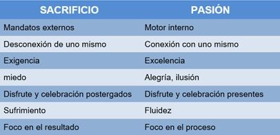 La emoción de la pasión es muy diferente de la del sacrificio, es una emoción de alegría y de ilusión, que emana de la clara conciencia personal de estar haciendo lo que queremos, viviendo la vida que hemos elegido, persiguiendo el objetivo que nos apasiona, aquello que sale de lo más íntimo de nuestro ser.