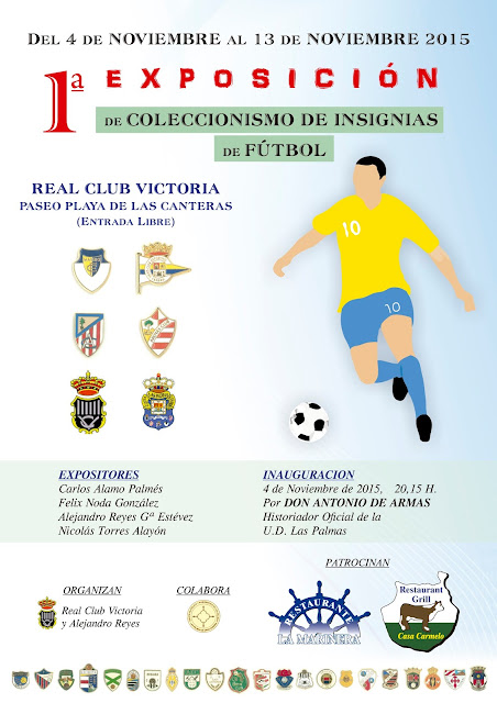 El Próximo mes de noviembre, concretamente del miércoles 4 al viernes 13, se va a Celebrar en el Real Club Victoria La Primera '' Exposición de coleccionistas de Insignias de Fútbol ''. Si Eres aficionado al deporte oa Dicha afición, no dejes de ACUDIR un this cita. La Inauguración se celebrará el día 4 a las 20.15 horas y estara a cargo del historiador oficial de la Unión Deportiva Las Palmas, Don Antonio de Armas.